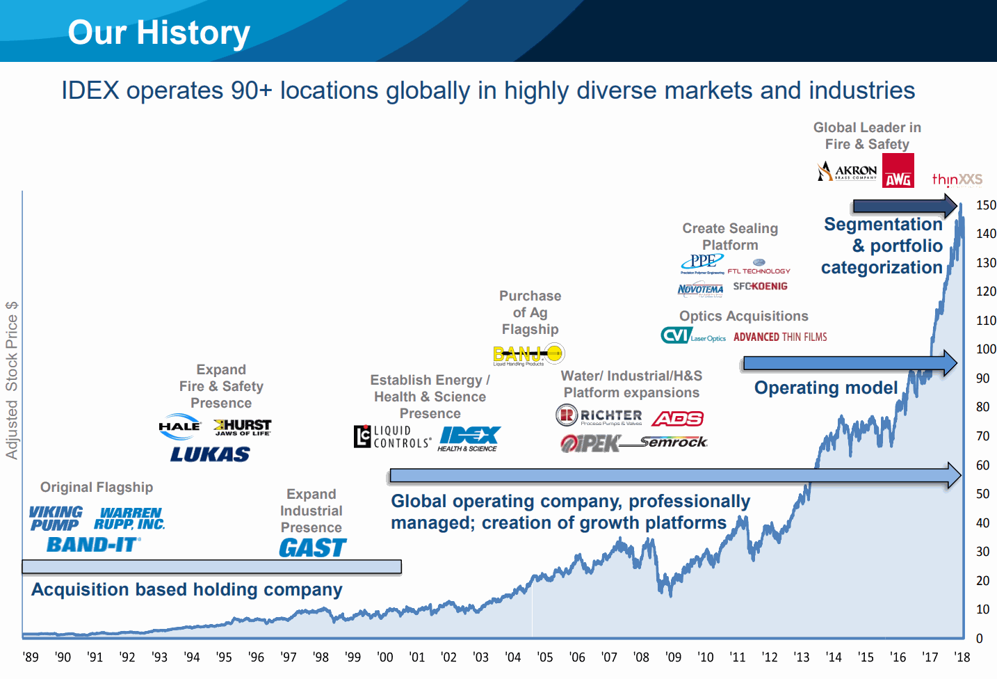IDEXの買収戦略は、ニッチ市場における既存事業と相補的・補完的な買収に重点をおいており、大規模な寡占のない断片化した市場で小型の買収を過去10年で約30件ほど行っている。
