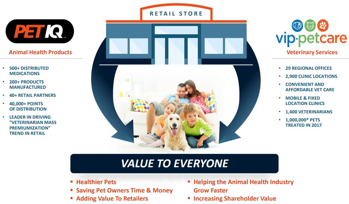 米国で2900以上の簡易動物クリニック(ワクチン接種などの手術を必要としない獣医サービス)をペット用品店や主要小売店などに併設しているVIP Pet Careを2018年1月に買収し、医薬品・卸・クリニックとペットヘルスケアの垂直統合プロバイダとなっている。
